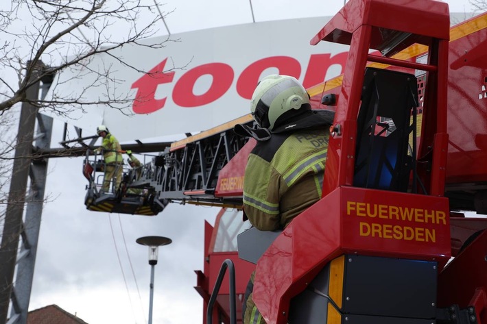Auf dem Parkplatz eines Baumarktes wurde durch Sturmeinwirkung ein etwa sechs Quadratmeter großes Werbeschild aus seiner Verankerung gerissen. Das Schild drohte aus etwa 15 Metern Höhe abzustürzen. Die alarmierten Einsatzkräfte der Feuerwehr sicherten zunächst die Einsatzstelle und brachten im Anschluss eine Drehleiter in Stellung. Aus dem Rettungskorb der Drehleiter heraus wurde das Schild zunächst gegen Absturz gesichert und in der Folge mit einem Trennschleifgerät zerteilt. Danach konnte das Schild gesichert zu Boden gebracht und die drohende Gefährdung beseitigt werden. Verletzt wurde niemand. Im Einsatz waren acht Einsatzkräfte der Feuer- und Rettungswache Löbtau.